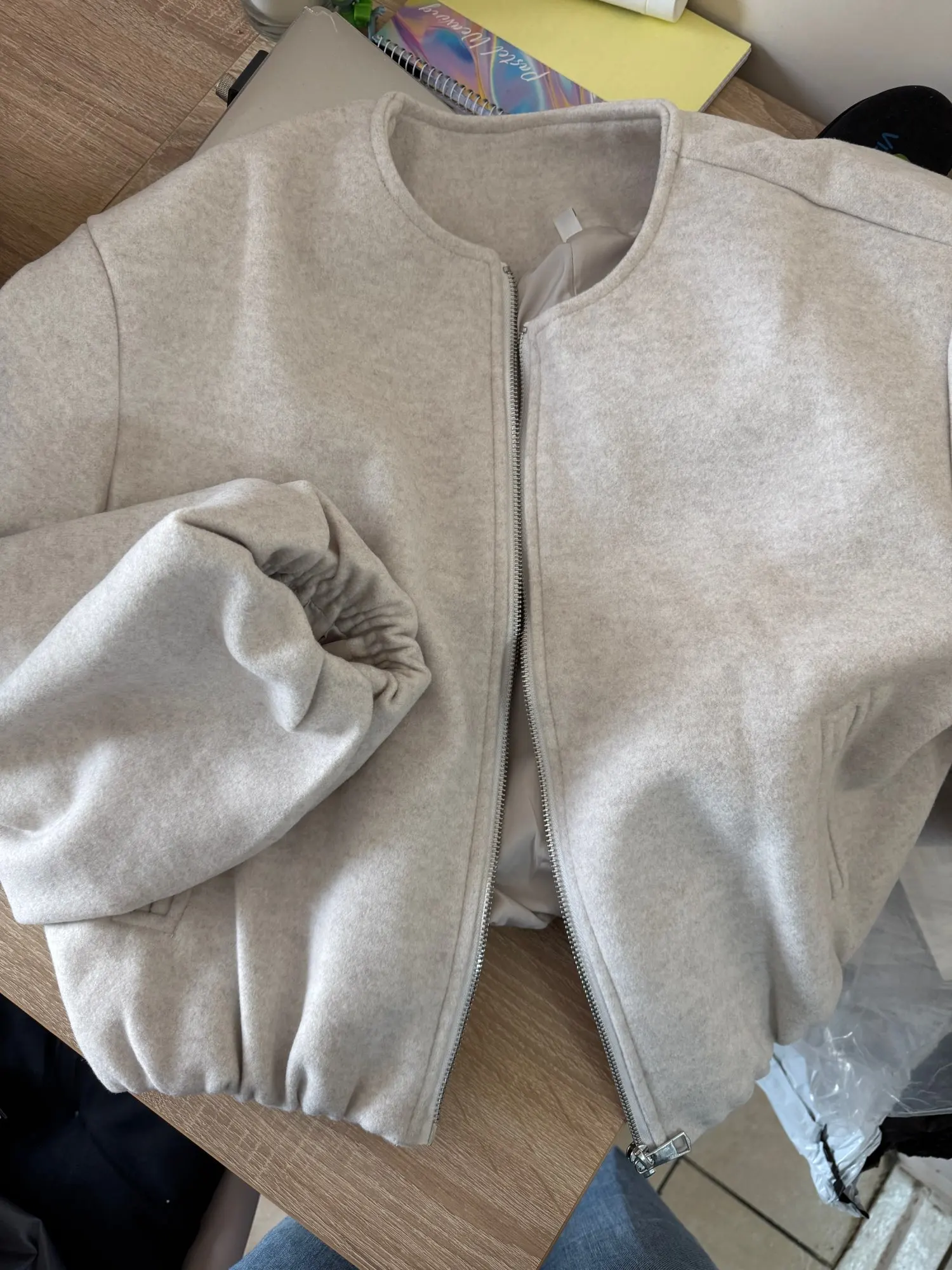 Retro round neck, full zip closure, long sleeves, thick yet soft construction, elastic hem and cuffs, solid colour design — a timeless bomber silhouette that works from morning errands to evening strolls.