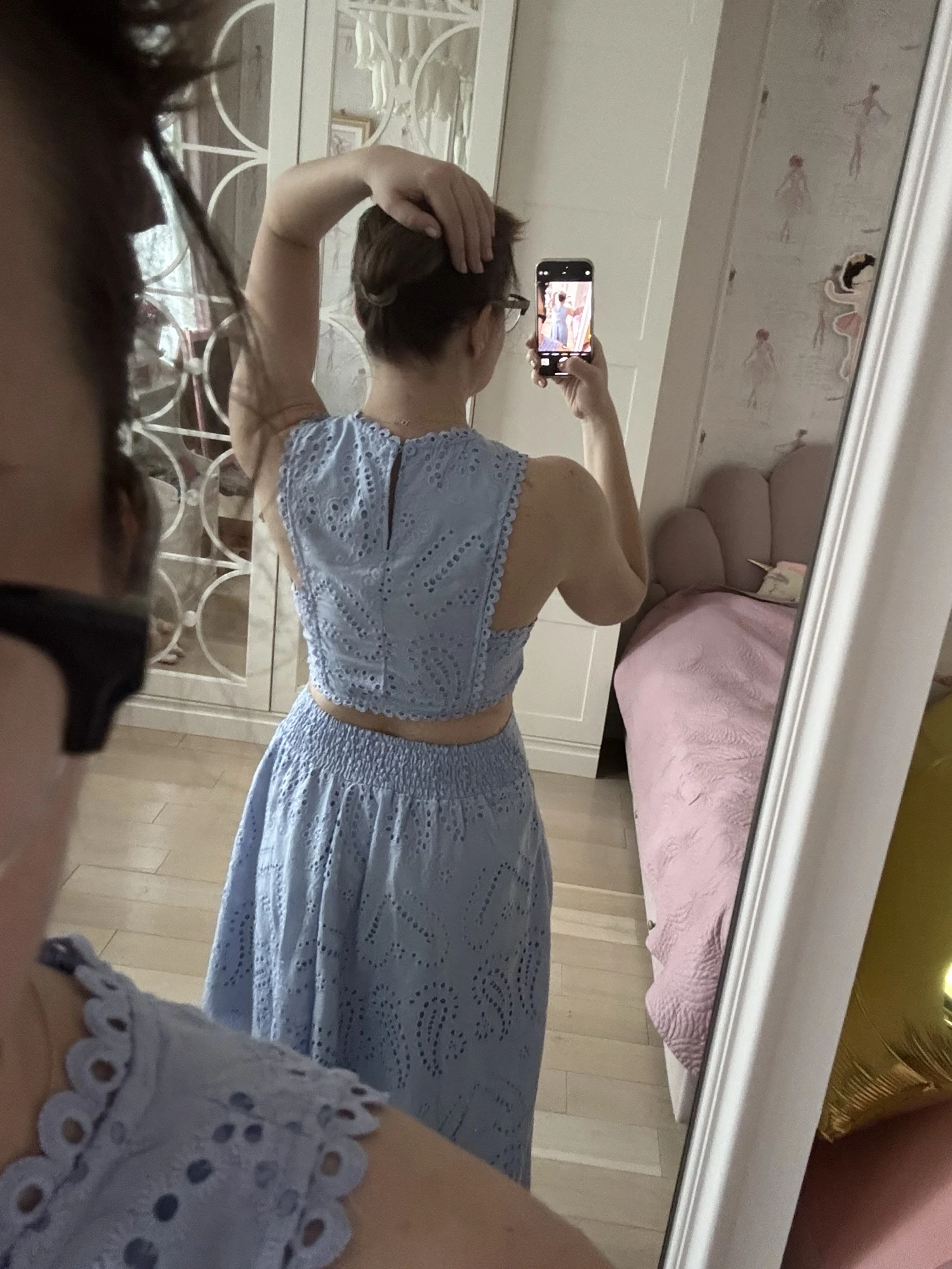 The skirt fits well, the top piece is small.