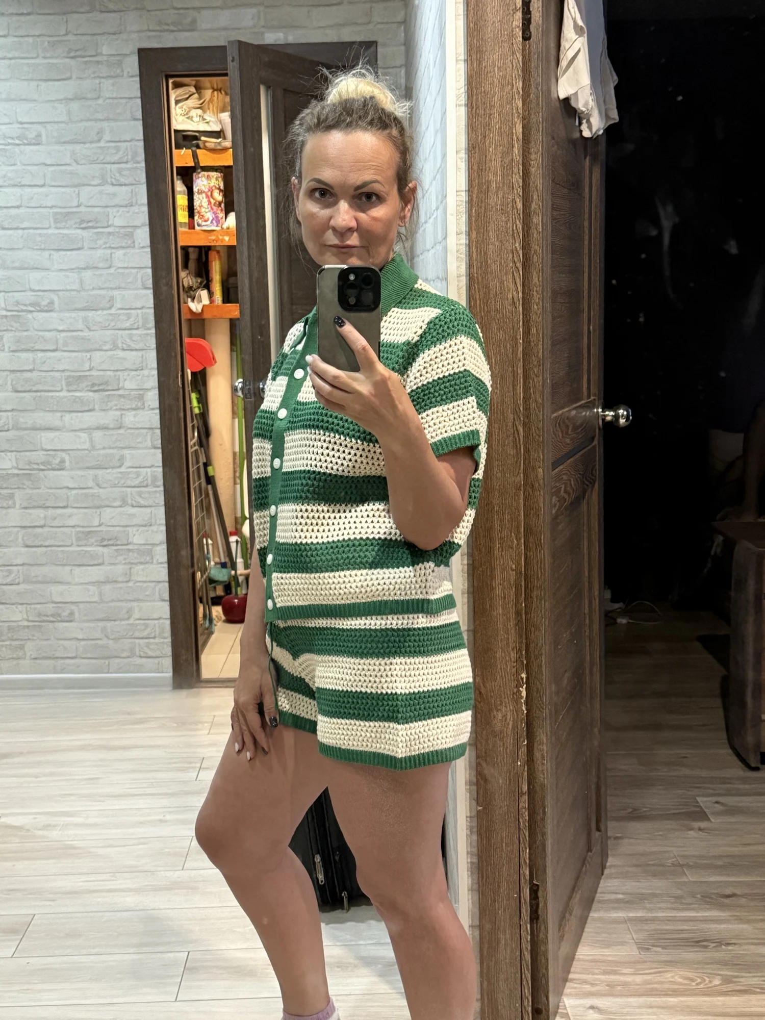 Slim-fit knit polo top, single-breasted front, short sleeves, high-waisted elastic shorts, solid colour, patchwork detail, and high stretch fabric — a relaxed yet refined take on summer style.