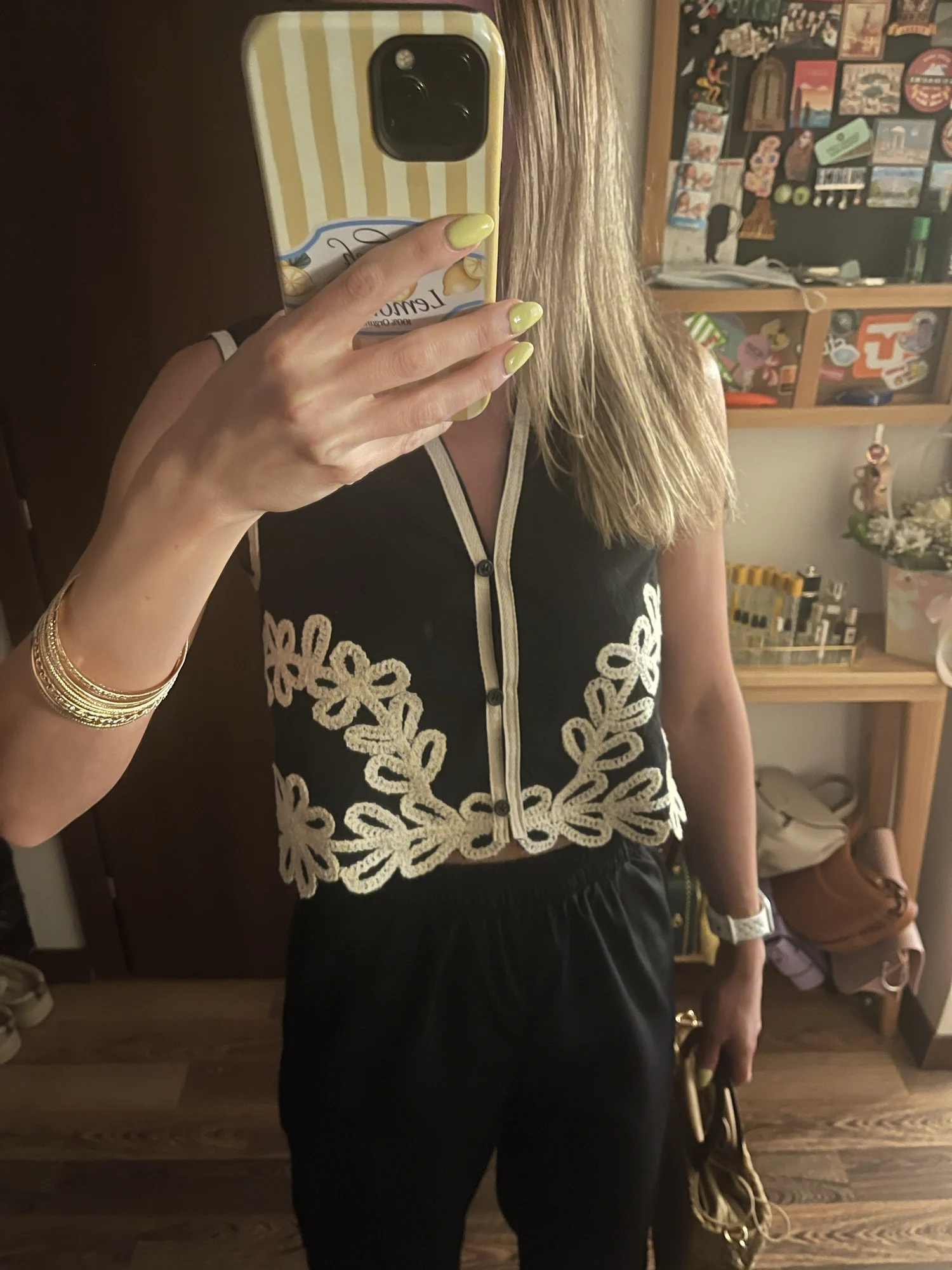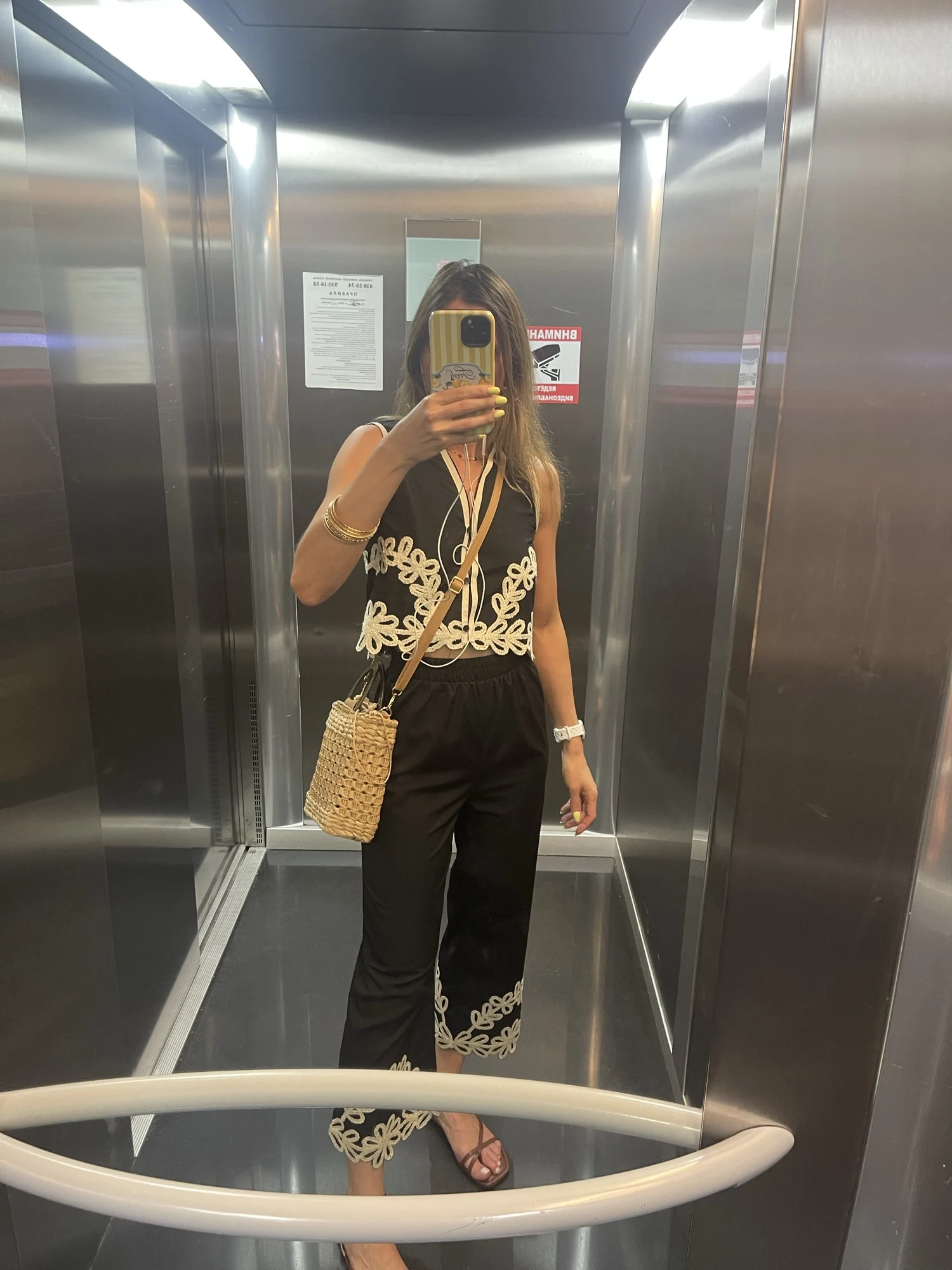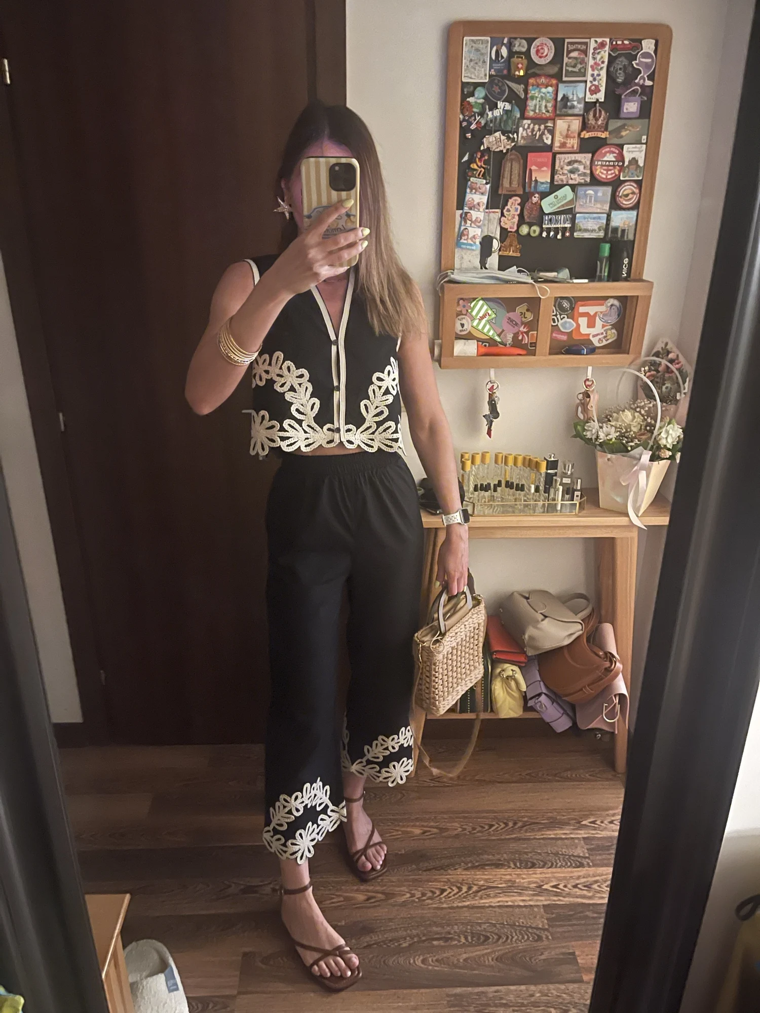 The cropped sleeveless vest features clean lines, a structured fit, and floral-inspired embroidery along the hem for a subtle statement. The matching high-waisted, wide-leg pants are tailored to flatter — with embroidered cuffs that mirror the top for a fully coordinated finish. Lightweight and breathable, this set is made for warm-weather elegance, perfect for rooftop dinners, gallery strolls, or dressed-up days at work.