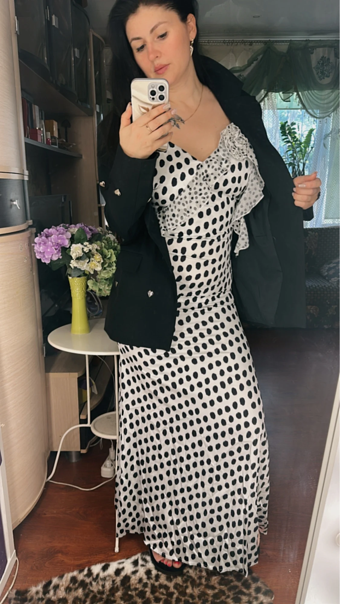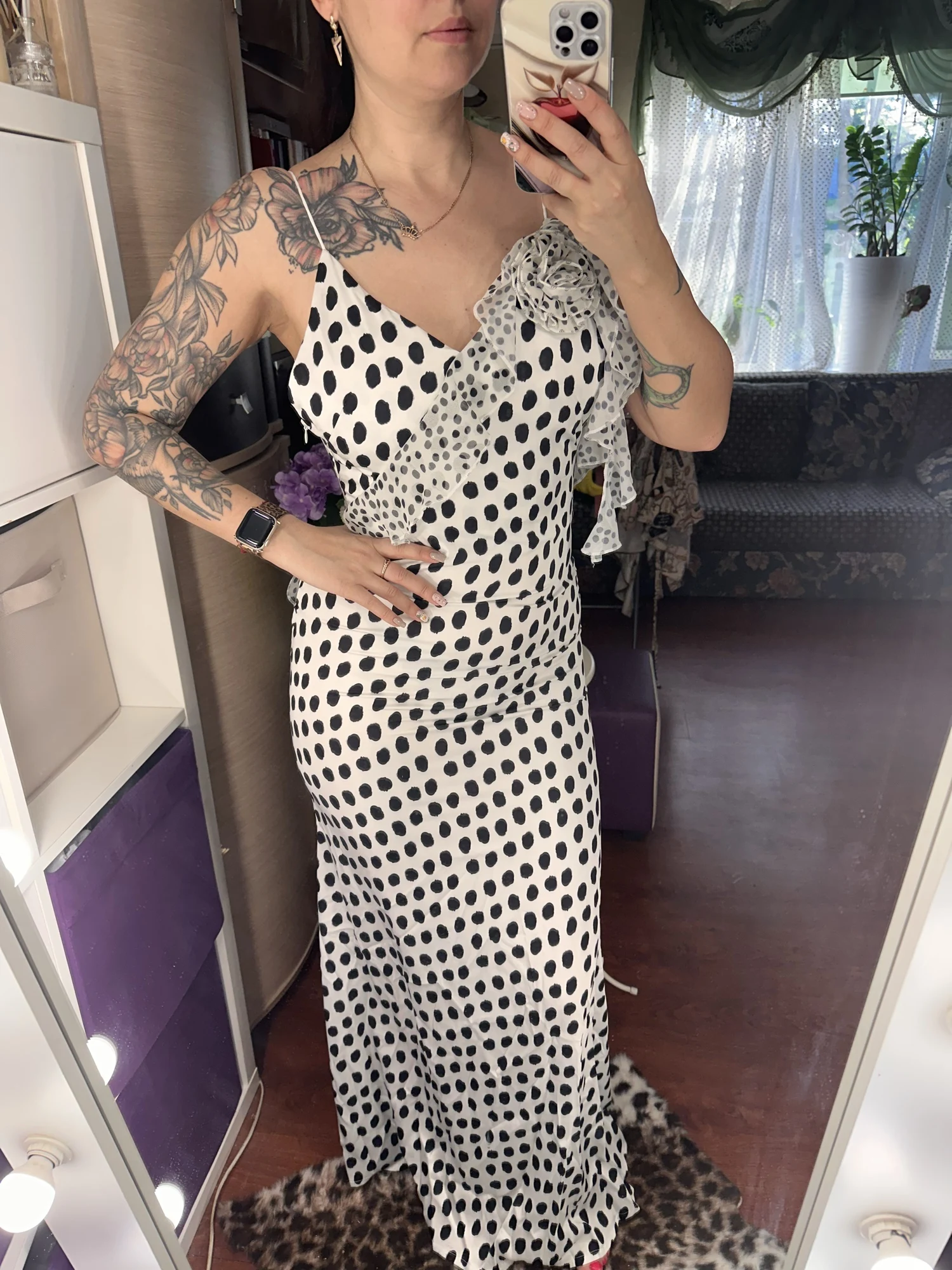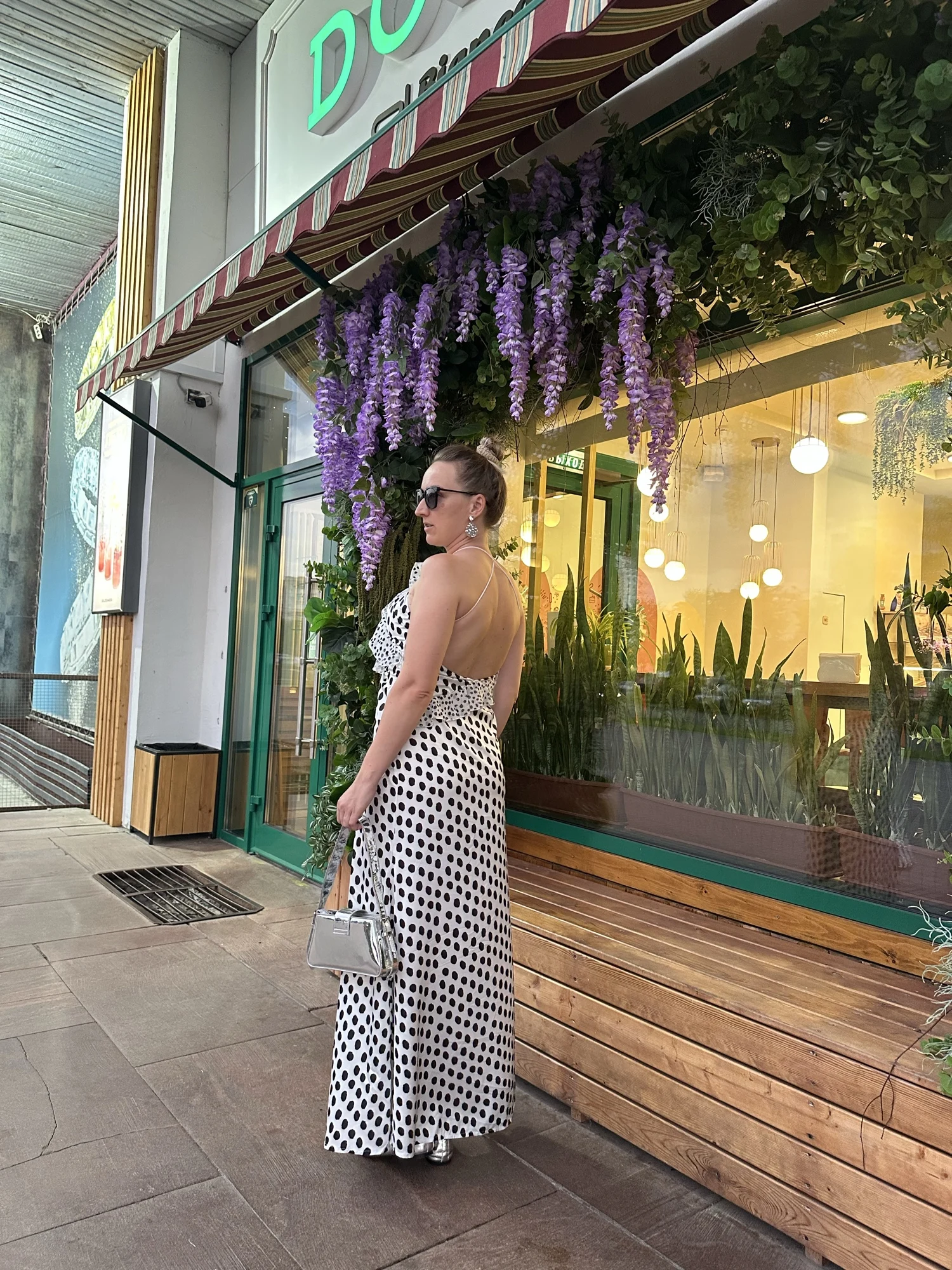 Classic spots, elevated with a little drama. The Sasha Dress is a flirty, floor-length number that brings vintage charm into the now. With its bold polka dot print, fluttery 3D ruffle detailing, and a sultry low-back cut, this dress was made to move — from sunset drinks to dance floor spins.